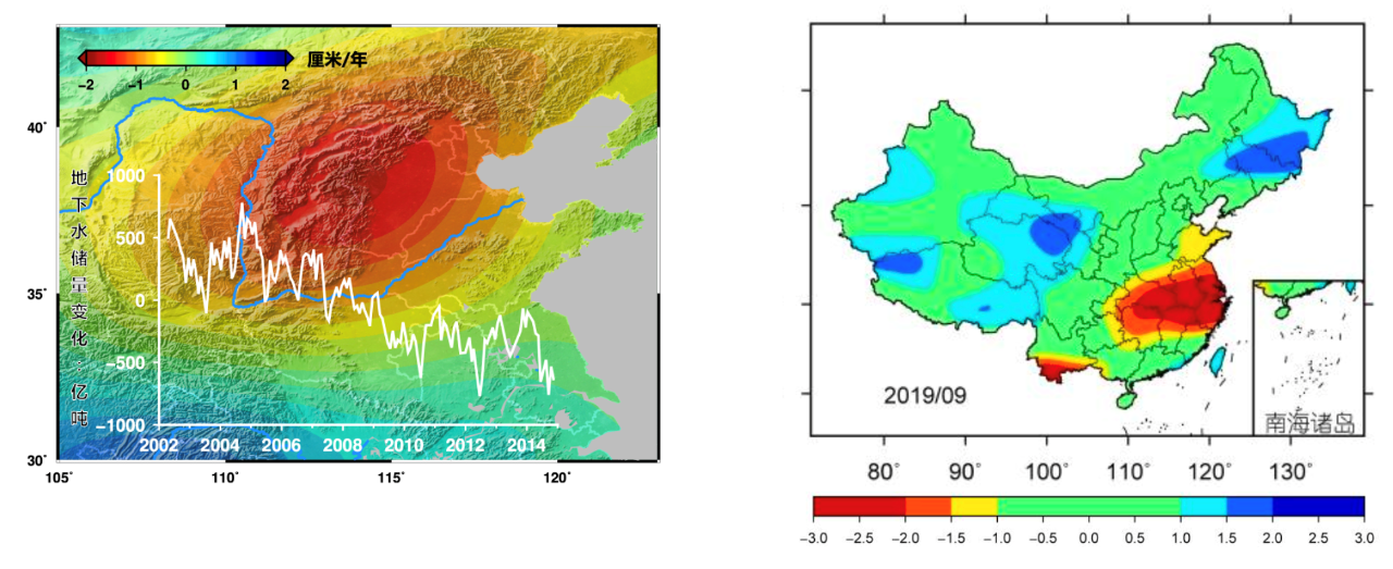 基于卫星重力监测的(左图)华北地下水时空变化和(右图)2019年长江中下游干旱事件示意图
