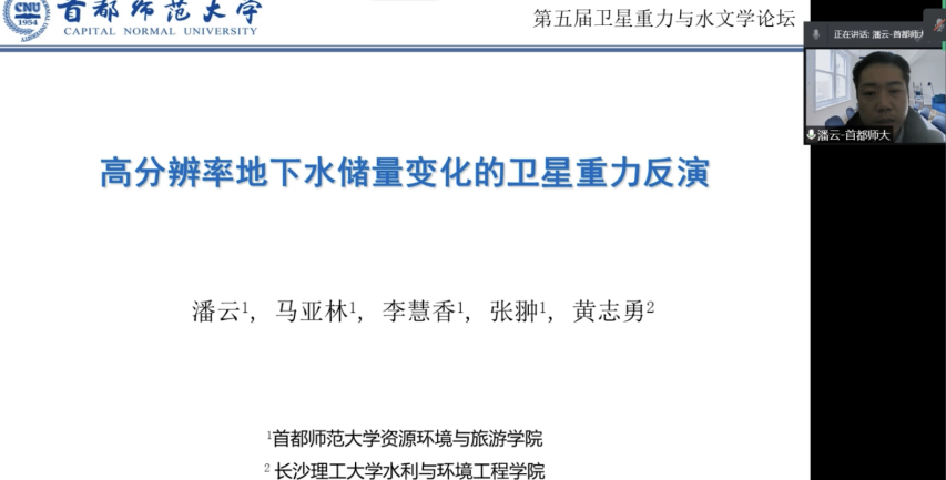 在邀请报告专题,清华大学龙笛研究员、首都师范大学潘云教授、北京师范大学胡立堂教授、南京大学徐于月副教授、阳明交通大学黄金维教授、德国波恩大学Jürgen Kusche教授和北京大学胡燮研究员等,从水文学、大地测量学和遥感等不同视角探讨了地下水变化的多源监测、卫星重力在水资源评估和气候变化研究中的作用等。本次研讨会共设有“卫星重力与地下水变化”、“Geodesy and Climate Change”、“卫星重力与区域水循环”、“卫星大地测量与水文遥感”、“卫星重力数据后处理”、“卫星重力反演与数值模拟”和“卫星大地测量与全球变化”等七个专题报告会场。来自国内外30多家单位的科研人员做了口头报告。本次参会的国内外代表主要来自(按报告先后顺序):老太阳集团tcy8722网站、清华大学、首都师范大学、北京师范大学、南京大学、中国农业大学、中国地震局地球物理研究所、长安大学、中国地质大学(北京)、西北农林科技大学、阳明交通大学、德国波恩大学、北京大学、华东师范大学、中国科学院精密测量科学与技术研究院、山东科技大学、福建师范大学、云南大学、中国地质大学(武汉)、华南农业大学、山东建筑大学、长江水利委员会水文局、南方科技大学、兰州交通大学、中国科学院西北生态环境资源研究院、中国科学院大学、武汉大学、中国空间技术研究院、华中科技大学、中国科学院上海天文台、信息工程大学和广东工业大学等。