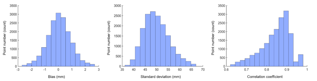 图2 重构海面异常时间序列与ESA CCI海面异常时间序列的a)偏差;b)差值标准差和c)相关系数。