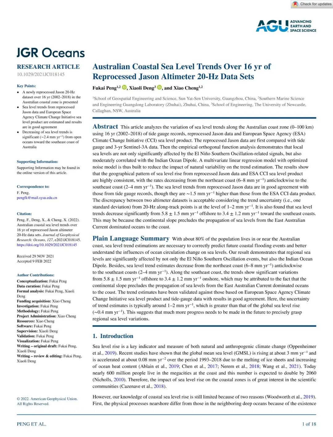 研究成果于2022年2月被“Journal of Geophysical Research:Oceans”期刊接收,题为“Australian coastal sea level trends over 16 yr of reprocessed Jason altimeter 20-Hz data sets”,老太阳集团tcy8722网站测绘科学与技术学院彭福凯博士为文章的第一作者兼通讯作者。