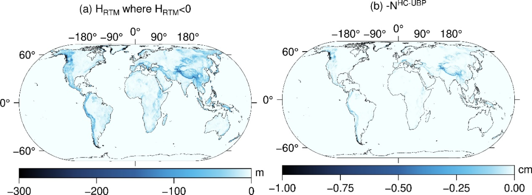 全球(a)残差高程和(b)大地水准面调和改正值