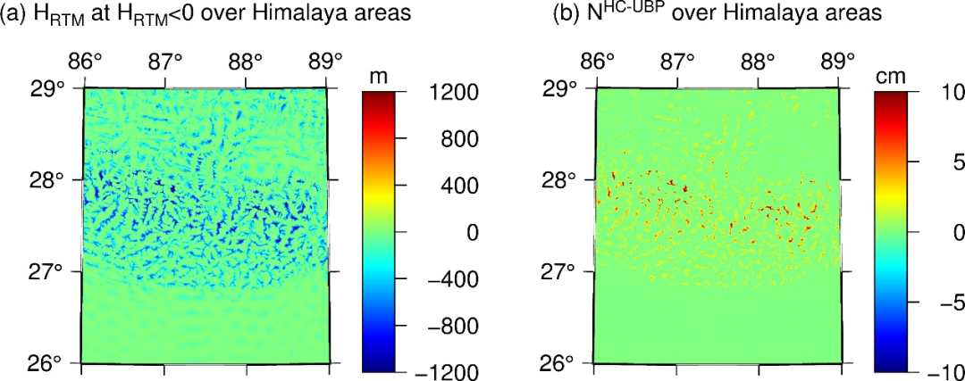 喜马拉雅区域(a)残差高程和(b)大地水准面调和改正值