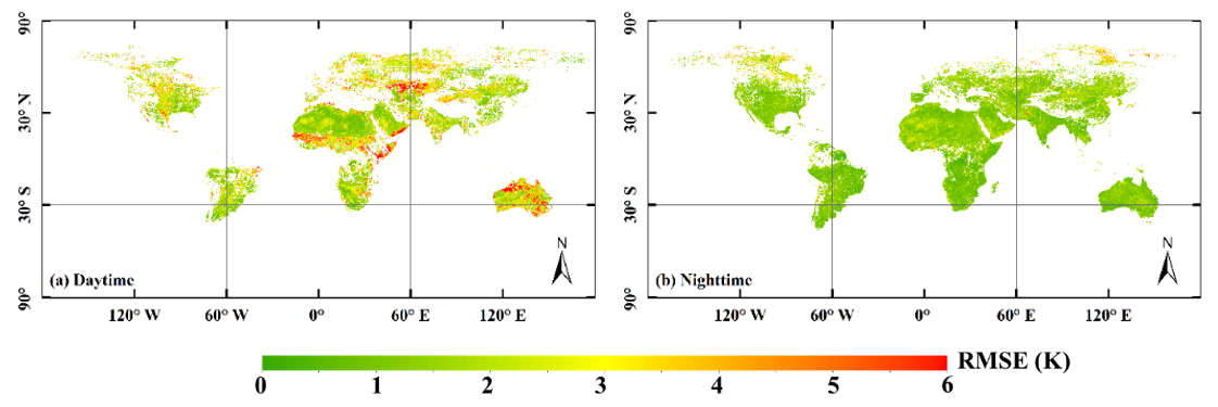 图1.本文方法LST反演结果与MODIS MYD11_L2 LST产品交叉验证RMSE全球分布:(a)白天,(b)晚上