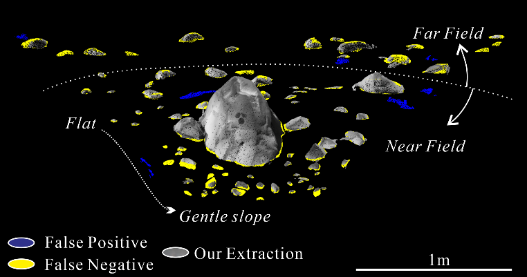 本研究提出一种由粗到精的三维岩石自动化提取方法,解决目前难以分割邻近岩石的问题;采用高精度三维岩石曲面重构及微分式的几何特征参数计算获取多类岩石三维形态特征,并利用岩石邻域获取更为精确的地形分布,减小地形起伏带来形态特征分析误差。实验结果表明,本研究所提出的三维岩石及其形态特征参数提取方法在多种模拟地形场景下的平均提取准确率超过90%,为基于岩石的行星科学研究提供了可行的思路和数据支撑。