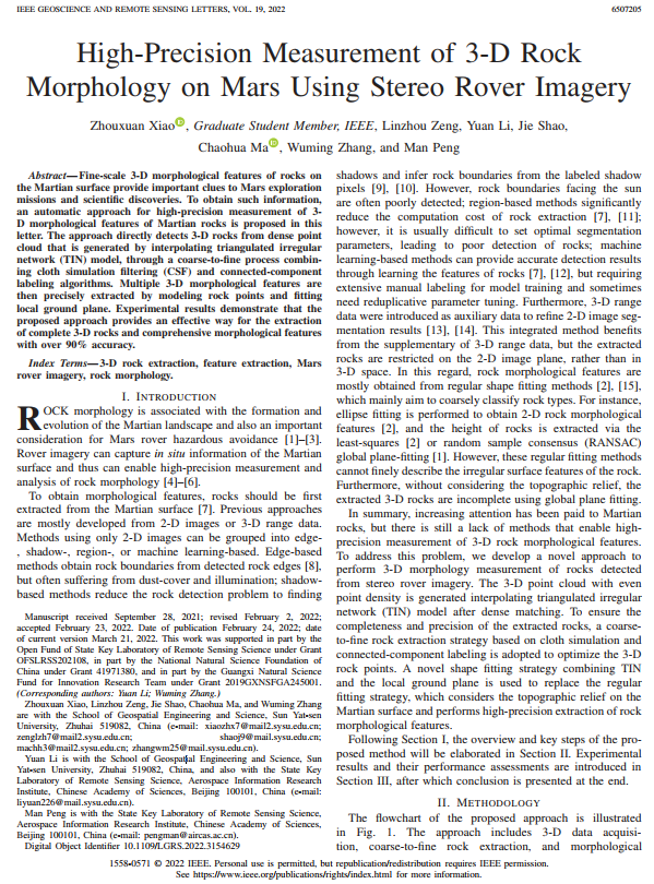 研究成果于2022年2月被“IEEE Geoscience and Remote Sensing Letters” 期刊接收,题为“High-Precision Measurement of 3-D Rock Morphology on Mars Using Stereo Rover Imagery”,由老太阳集团tcy8722网站测绘科学与技术学院3D团队博士生肖宙轩、硕士生曾林洲、助理教授李媛、博士后邵杰、硕士生马潮华、教授张吴明,以及中科院空天信息创新研究院副研究员彭嫚合作完成,我院李媛助理教授和张吴明教授为文章的共同通讯作者。