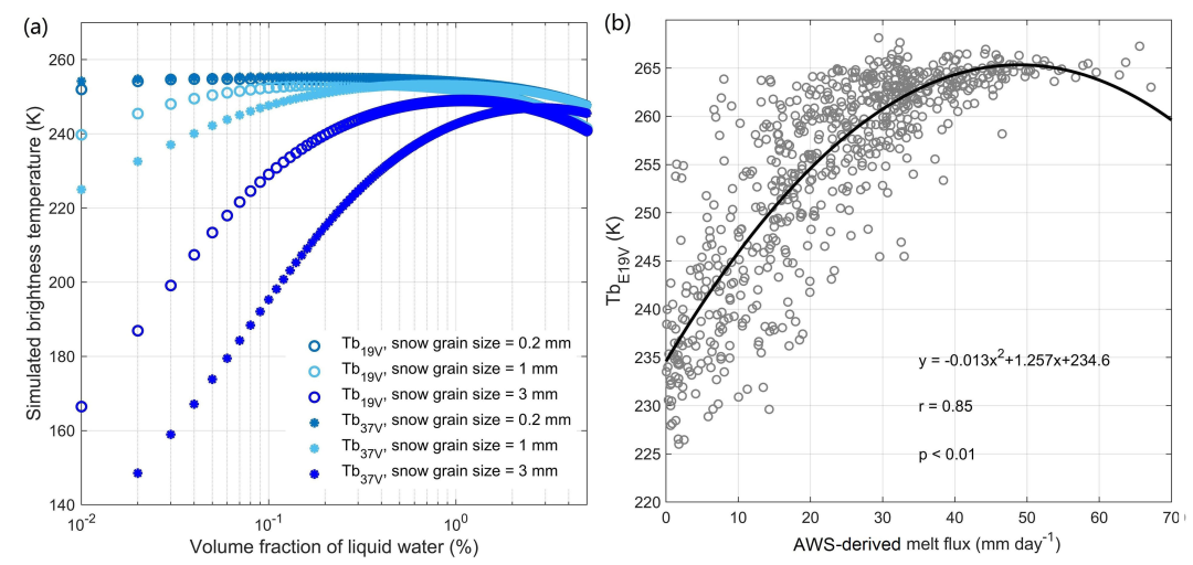 图1 微波亮温对冰盖融化的响应。(a)多层积雪微波辐射传输模型(MEMLS)模拟的雪层液态水与微波亮温之间的关系;(b)表面融雪模型模拟的格陵兰冰盖SCO_U站融化通量与SSMIS亮温散点图。