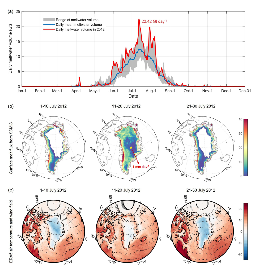 图2 格陵兰冰盖2012年极端融化事件。(a)格陵兰冰盖逐日平均融化量(蓝线)与2012年逐日融化量(红线)。(b)格陵兰冰盖2012年7月上、中、下旬平均融化通量。(c)格陵兰冰盖2012年7月上、中、下旬平均温度场及风场。