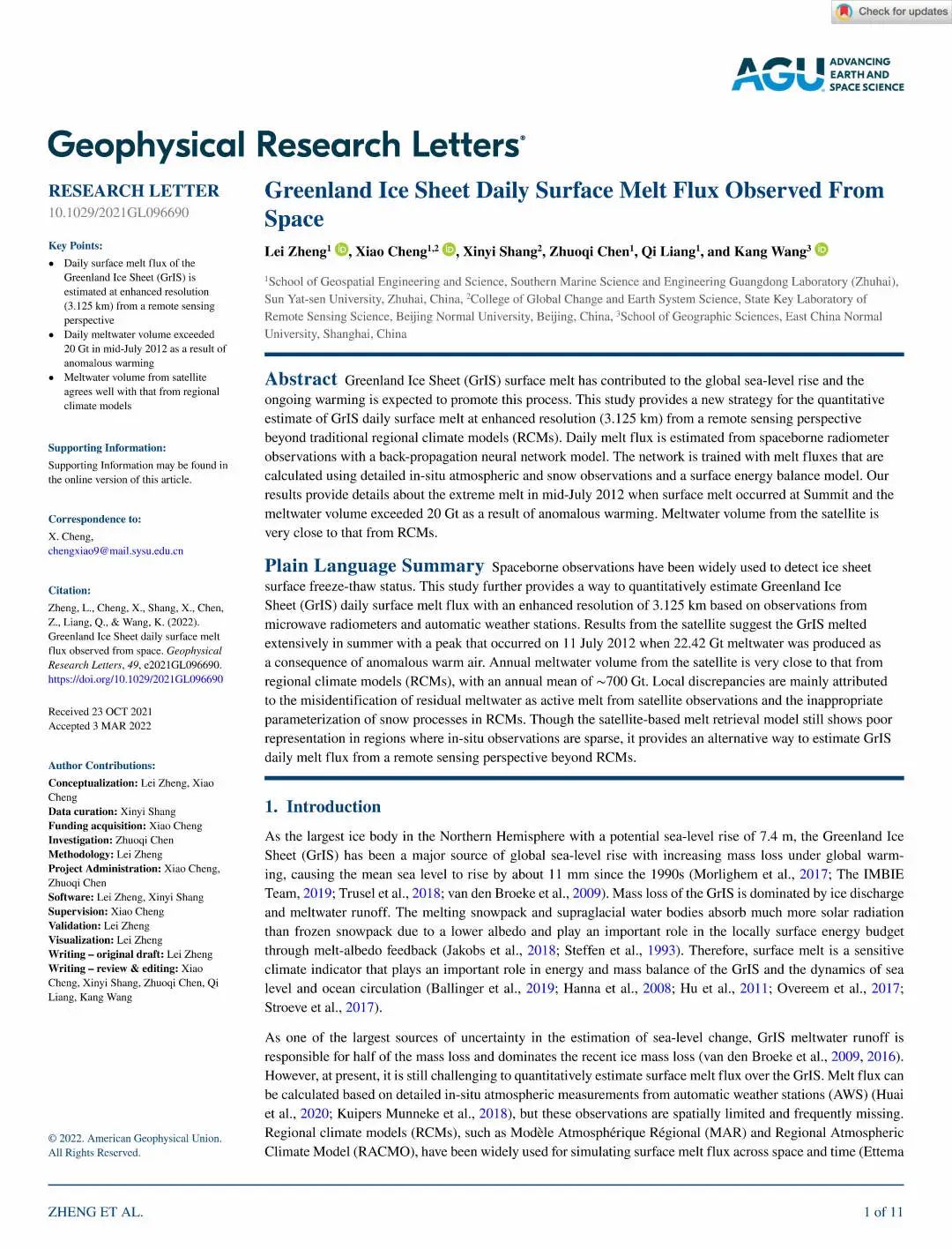 科研动态:郑雷博士在GRL发文首次实现格陵兰冰盖融化量遥感估算