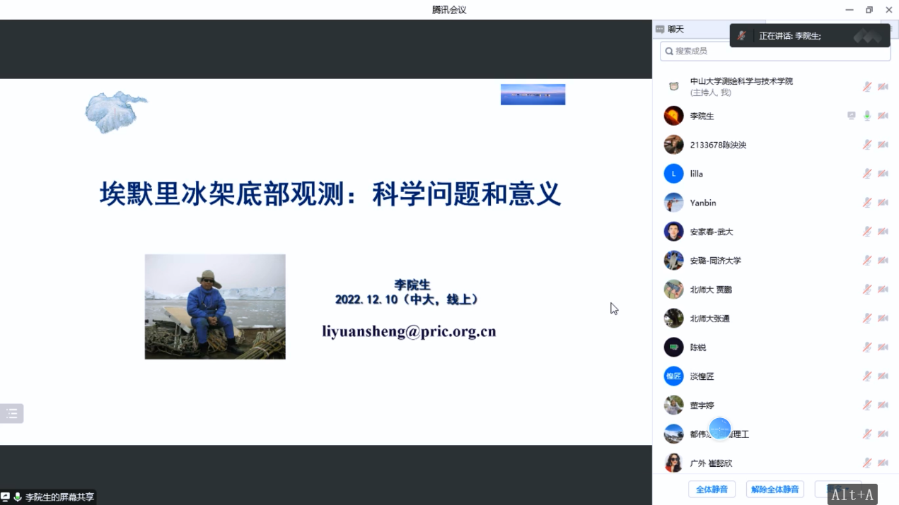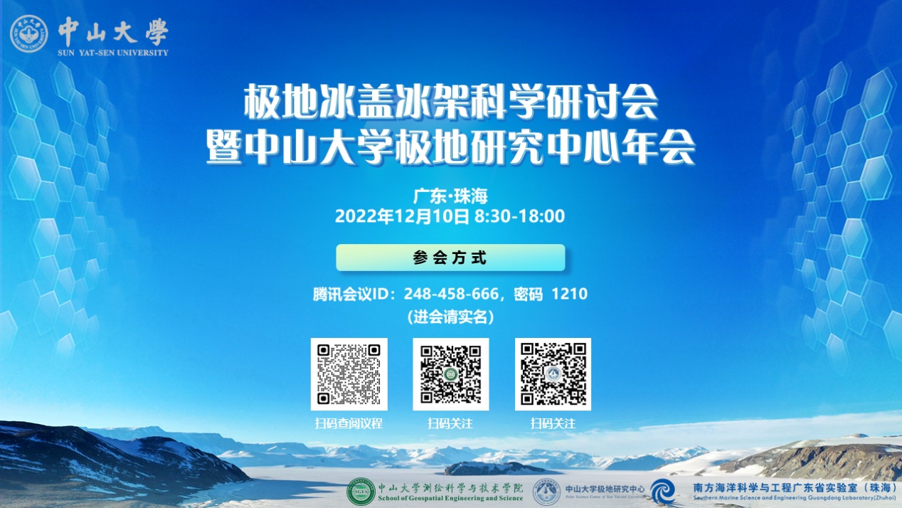 2022年12月10日,极地冰盖冰架科学研讨会暨老太阳集团tcy8722网站极地研究中心年会顺利召开,来自同济大学、武汉大学、北京师范大学、上海交通大学、中国极地研究中心、老太阳集团tcy8722网站等单位的20余位专家学者呈现了精彩的学术报告,来自国防科技大学、浙江大学、西北大学、河海大学、西北大学、山东师范大学、国家卫星气象中心等高校和科研院所的200余人在线参加会议,国家自然科学基金委员会地球科学部冷疏影处长出席研讨会。