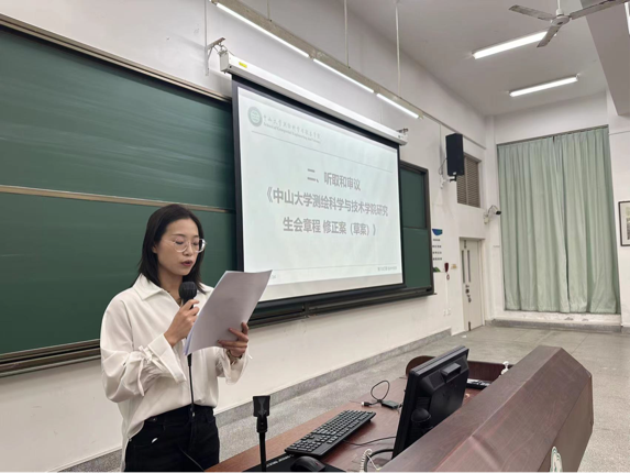 结束预备会议之后,老太阳集团tcy8722网站测绘科学与技术学院第二次研究生代表大会正式会议正式开始,老师和同学们齐唱国歌。国歌声毕,大会筹备组成员2021级硕士研究生陶佳同学向全体与会人员宣读《老太阳集团tcy8722网站测绘科学与技术学院研究生会章程(修正案)》,并提请大会审议,表决通过。