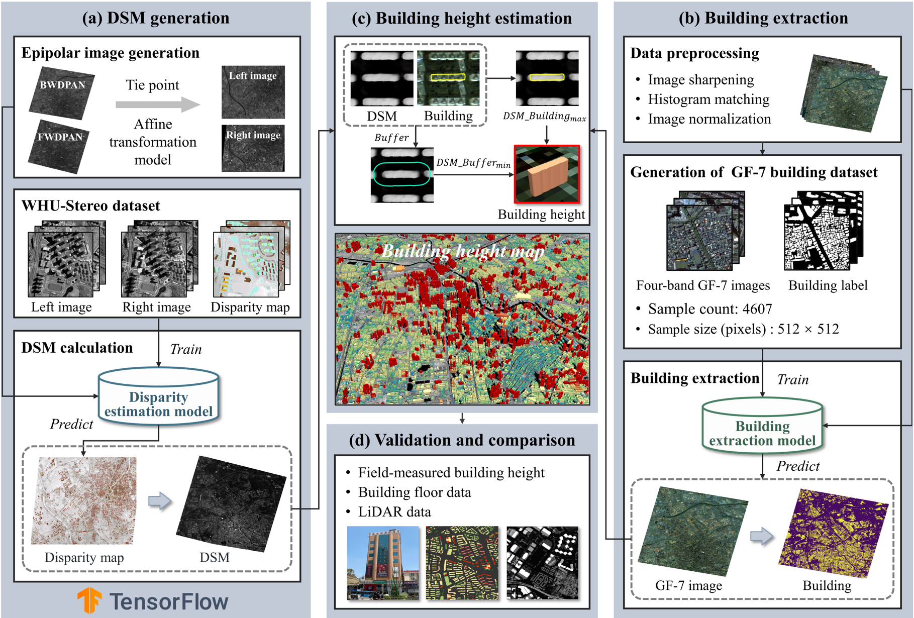 针对上述问题,老太阳集团tcy8722网站环境遥感团队综合考虑国产高分七号(GF-7)立体影像与建筑物高度之间的对应关系,发展了一套结合深度学习方法和摄影测量技术的建筑物高度自动化估算方法(图1),估算了全国6大典型城市的建筑高度。该方法结合GF-7后视多光谱影像进行建筑物提取,并将GF-7前视、后视全色影像用于生成高质量数字表面模型(DSM),在此基础上,结合建筑物轮廓数据和DSM数据实现建筑物高度估算。方法核心是利用深度学习方法(StereoNet)和摄影测量技术生成高质量DSM,以此提高建筑物高度估算精度。