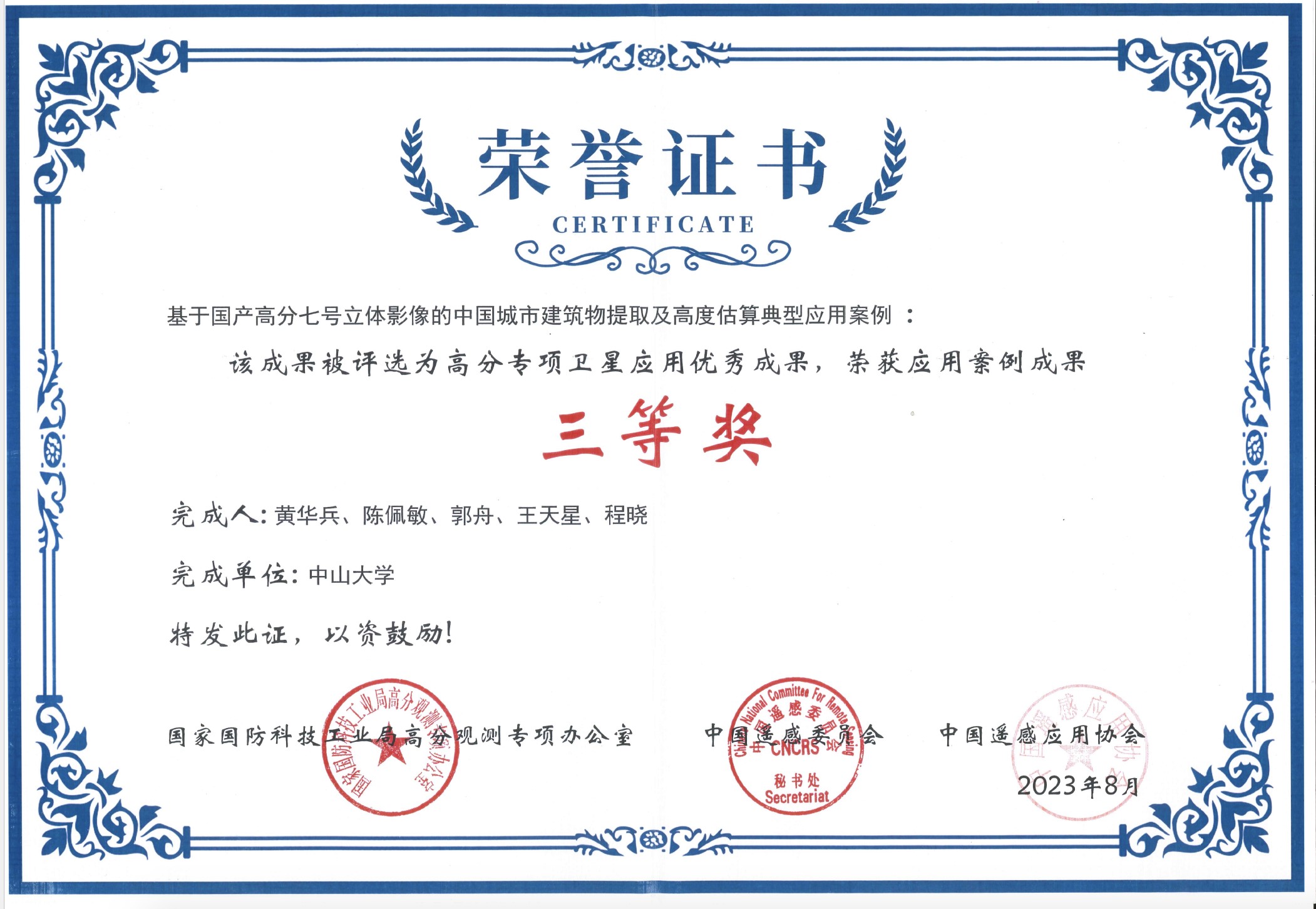 《高分专项卫星应用优秀成果》三等奖