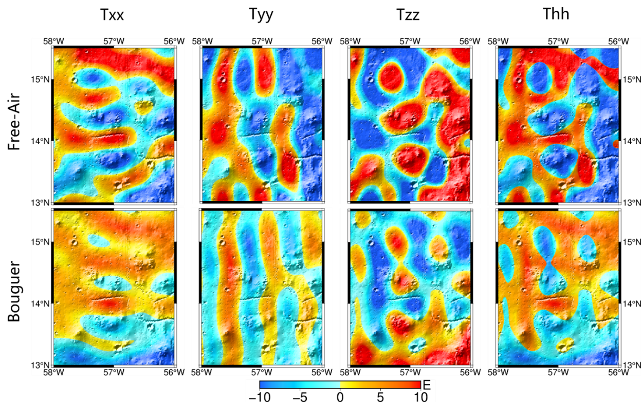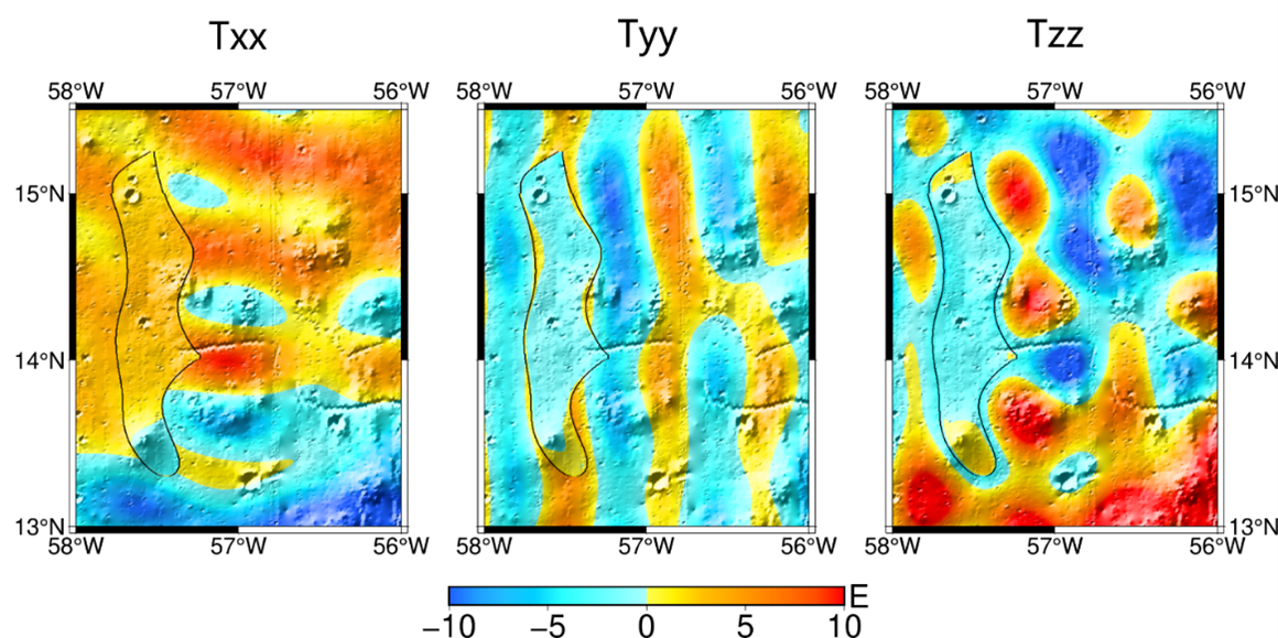 本文对月球Marius Hills地区的重力梯度分量进行了计算。该地区位于纬度范围13°N - 15.5°N,经度范围56°W - 58°W(见图1)。研究发现,在经度约为57.5°W,纬度约为14.5°N的中心区域存在质量亏损现象,推测该区域可能存在地下熔岩管。这一熔岩管的长度约为60公里,呈南北走向,在布格重力梯度图中表现十分明显。同时,在自由空气重力梯度Tyy和Thh分量中也出现了对应的异常特征。