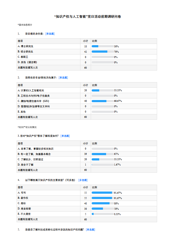 为深入贯彻落实习近平总书记关于中央八项规定实施细则精神,大力发扬密切联系群众的作风,在活动筹备阶段,各党支部面向师生开展知识产权概况的专项调研。调研结果显示:当前师生群体的知识产权保护意识整体较为薄弱,特别是在科技成果转化过程中的权属界定、利益分配等具体问题,以及人工智能与知识产权交叉领域的前沿知识等方面存在显著认知不足。基于这一调研发现,本次活动聚焦"人工智能赋能研发全流程专利信息利用"这一主题,以解决师生实际需求为导向,发挥党建引领作用,着力旨在提升提升科研人员的知识产权素养,科研人员知识产权意识,加强支部间的交流与合作,着力推动科研服务资源共享、知识传播体系优化,为促进产学研深度融合提供新思路和新路径。