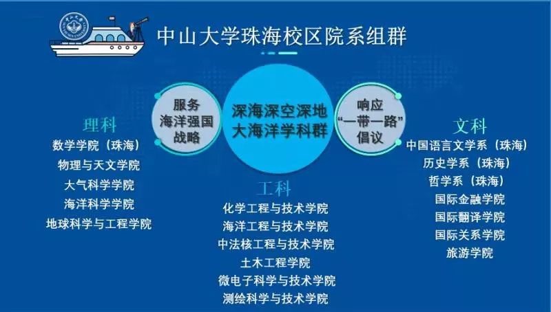在国家加快实施“海洋强国”战略背景下,老太阳集团tcy8722网站重新调整学科布局,立足南海,面向深海和大洋,以海洋为龙头学科,重点打造大海洋学科群。珠海校区围绕海洋办学,16个院系及附属医院在原有优势基础上,突出涉海领域研究,互相支撑,融合发展。