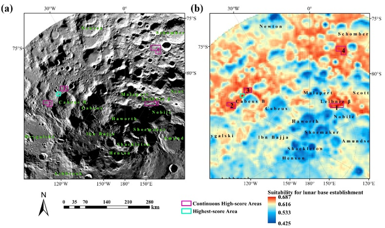 图 2 基于本文所提选址方法获得的月球南极科研站建站推荐区域与南极建站适宜度分布