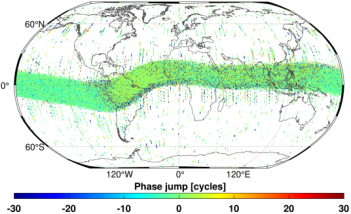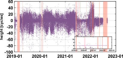 时域图中粉色区域表示LRI数据中断,纵坐标表示每个相位跳跃的高度,正值表示向上跳,幅值表示向下跳。空域图中相位跳跃高度用色标颜色表示