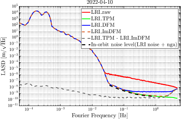 图2 LRI系统有偏距离频谱对比。红色曲线为原始测距频谱,绿色、蓝色和橙色曲线分别为采用主流模板法、差分法和改进差分法的处理结果,黑色虚线为LRI在轨测量噪声水平