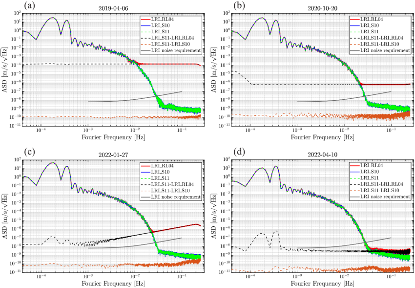 图3 RL04、S10和S11产品的LRI系统有偏距离变率频域对比。图中红色、蓝色和绿色曲线分别代表RL04、S10和S11的处理结果,黑色与橙色曲线分别表示S11与RL04、S10的差值,灰色曲线表示LRI的噪声需求