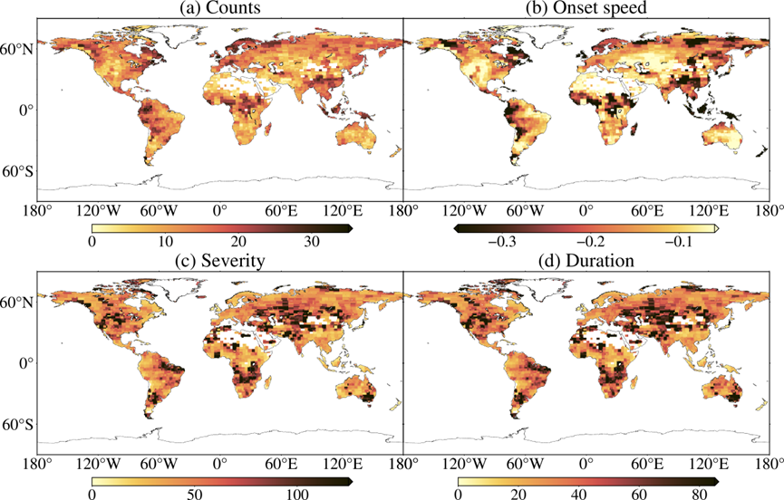 图1 1979-2018年全球水文骤旱指标的空间分布:(a)骤旱频次;(b)爆发速度;(c)严重程度;(d)持续时间