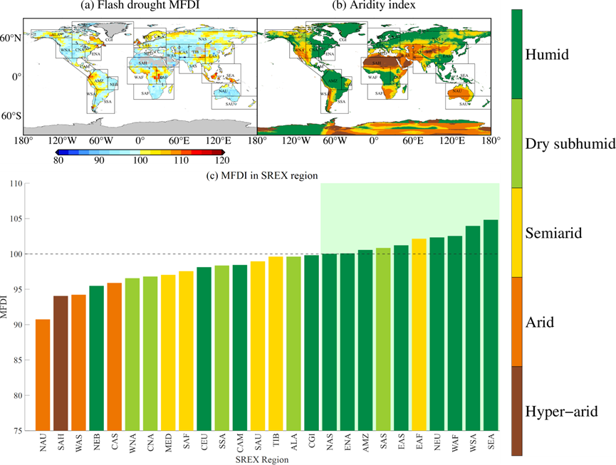 图2 骤旱综合指数(MFDI)的空间分布(a)、干湿指数与气候分区(b)以及IPCC SREX区域MFDI统计(c)