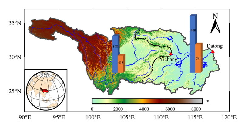 图3 长江上游及中游流域。蓝色和橙色柱分别表示多年平均的降水和径流量(mm)