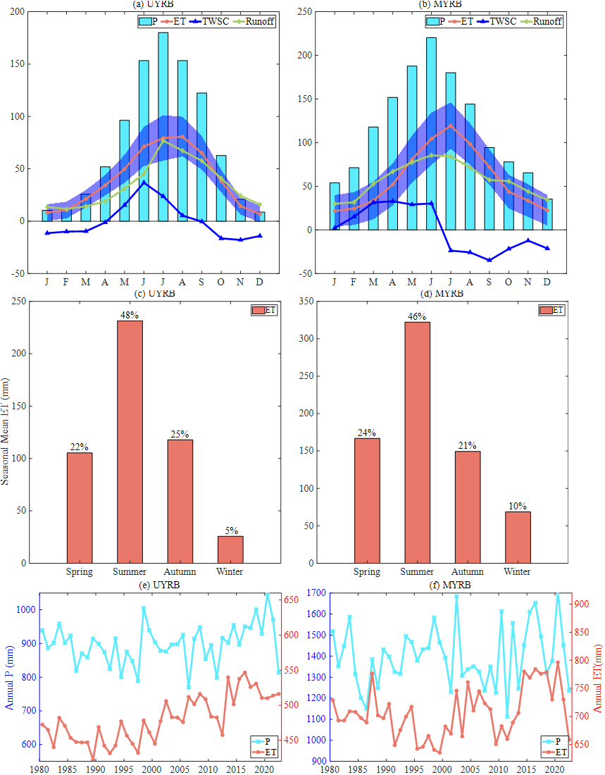 (1)长江上游(UYRB)蒸散发量在6-9月间变化平稳,8月达到峰值,长江中游(MYRB)的蒸散发量则在7月达到峰值(图4)。两个流域的蒸散发峰值均滞后于降水和径流峰值约一个月,体现了水文过程对蒸散发的调控作用。季节分布上,夏季蒸散发占年总量约50%,春秋季节占比20%-25%,冬季占比最低,不足10%。