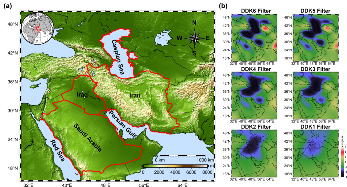 图1.(a)中东研究地区示意图;(b)不同强度滤波方法得到的陆地水储量变化趋势信号对比。