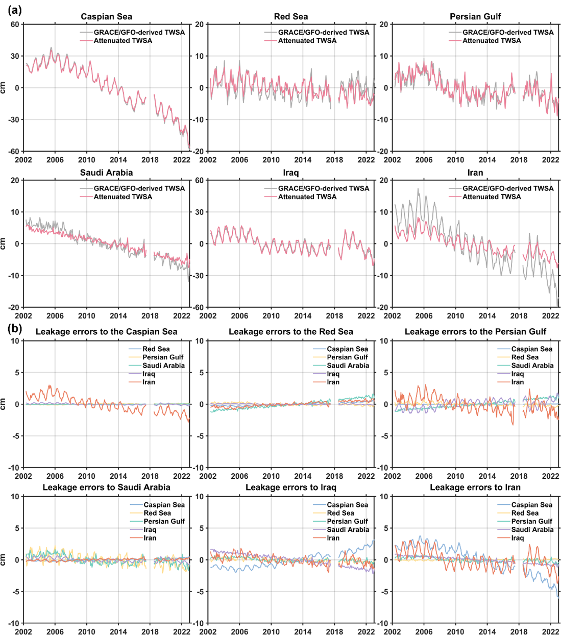 图2. (a)GRACE/GFO TWSA与衰减的TWSA在各个区域的时间序列;(b)各区域来自其他区域的泄漏误差时间序列。