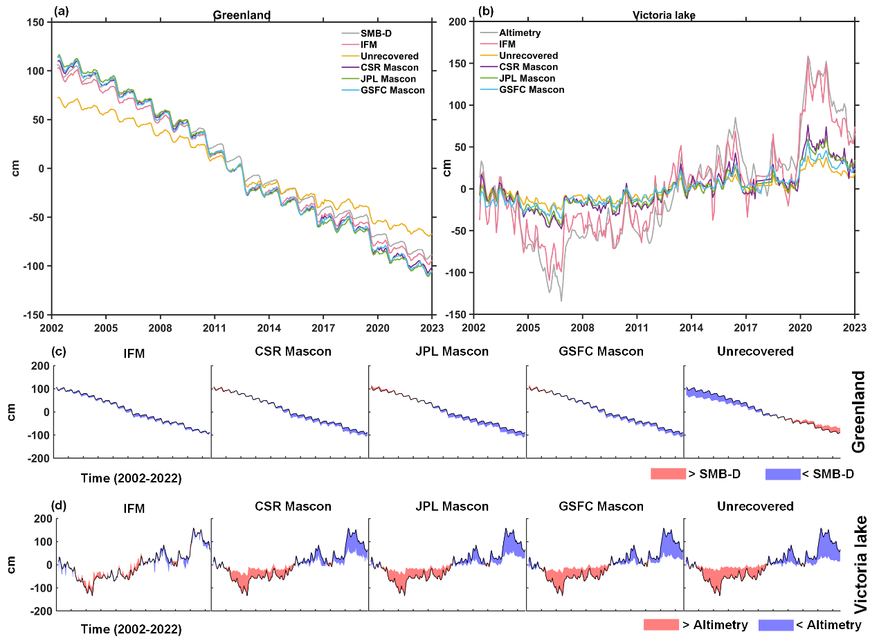 图4. (a)格陵兰质量变化时间序列;(b)维多利亚湖水储量变化时间序列;(c)在格陵兰与SMB-D对比填充图;(d)在维多利亚湖与测高结果对比填充图。红色/蓝色阴影表示各无模型方法恢复结果与真实值的偏差,颜色越浅代表该方法性能越好,与真实值越接近。