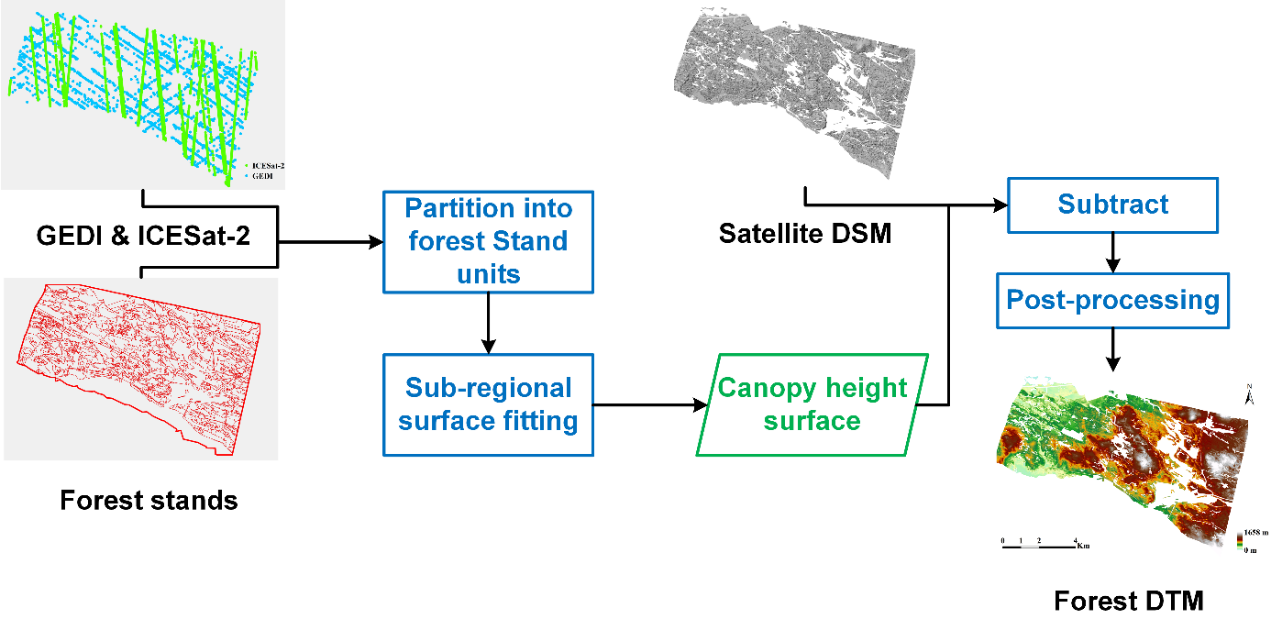 数字地形模型(DTM)在地理空间分析与环境应用中具有重要意义,然而,森林地区的DTM生成仍面临诸多挑战。目前主流的全球地形产品多基于卫星立体摄影测量或InSAR技术构建,因其对植被的穿透能力有限,难以准确反映林下地形,常在植被密集区域产生系统性高估。尽管机载激光雷达具备较高的测绘精度,但其高昂的成本与受限的覆盖范围,制约了其在大尺度森林区域的广泛应用。因此,亟需一种具备低成本与可扩展性的从卫星数据中提取林下地形信息的方法。为应对这一需求,本文提出了一种简便且具备良好可解释性的林下地形提取方法,融合我国高分七号(GF-7)亚米级卫星立体像对与GEDI及ICESat-2星载激光雷达数据,构建了一套适用于森林区域的地形建模方法体系。