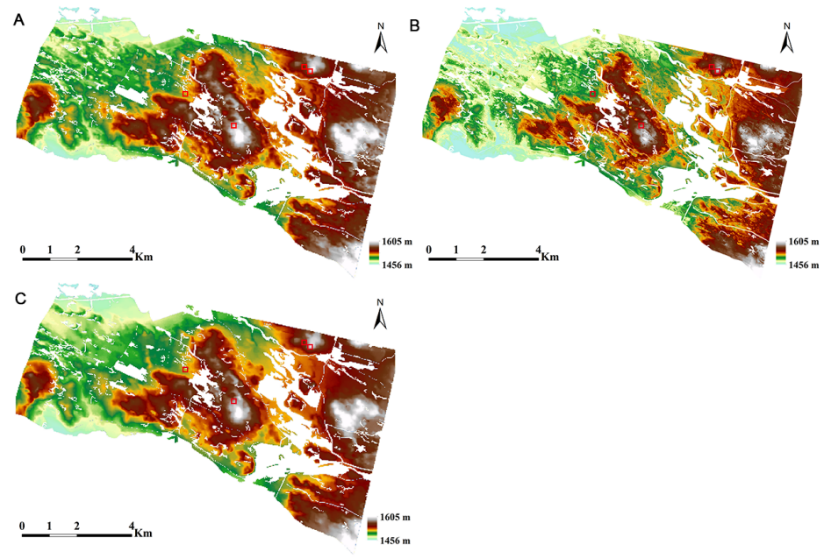 图1本研究提出的森林DTM和CopDEM、FABDEM对比图。(A) CopDEM,(B) 森林DTM,(C) FABDEM