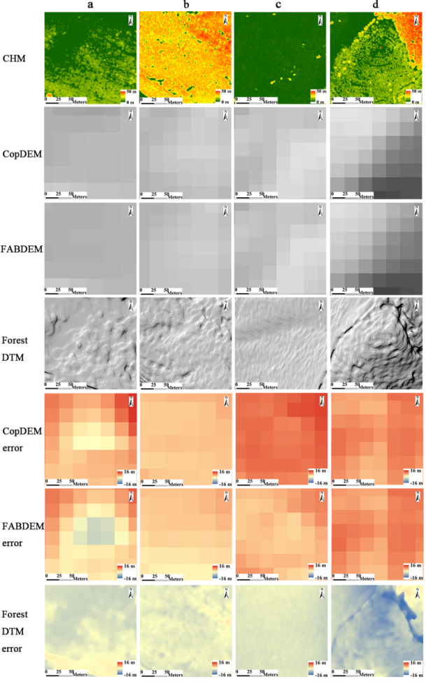 图3 CopDEM、FABDEM 与本文提出的森林数字高程模型(Forest DTM)在四个代表性子区域(a-d)中的比较:每个子区域包含ALS森林冠层高度图(展示森林覆盖)、数字高程模型山体阴影图,以及相对于ALS DTM的高程误差图。