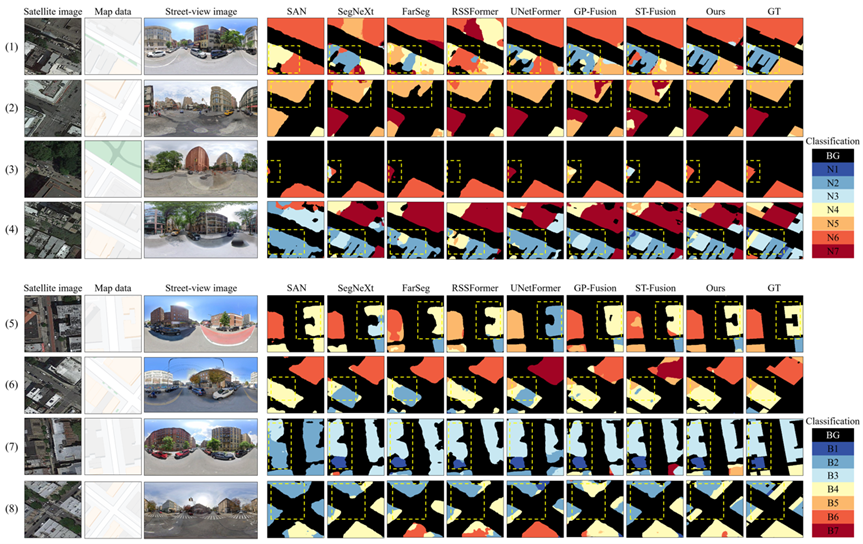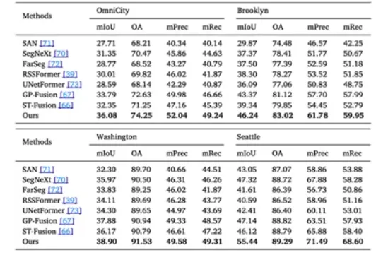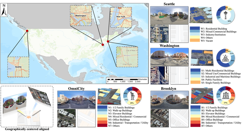 为充分评估CRFFNet在建筑精细属性识别任务中的表现,本研究构建了两个全新的跨视角数据集——Washington 与 Seattle,分别包含地理对齐的卫星影像、地图数据与全景街景图像。建筑物精细属性标注来自于各地政府的开源信息,建筑精细属性覆盖全面且分类清晰。此外,本文也在两个公开数据集(OmniCity 与 Brooklyn)上同样进行了广泛的对比实验,涵盖通用分割方法、遥感场景分割方法和跨视角方法三类代表性算法。