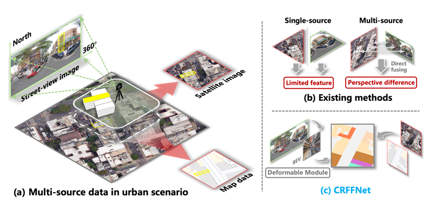 研究成果发表于 Information Fusion,论文题目为:CRFFNet: A cross-view reprojection based feature fusion network for fine-grained building segmentation using satellite-view and street-view data。我院22级硕士研究生于锦华与24级硕士研究生叶俊言为论文的共同第一作者,环境遥感团队李唯嘉副教授为论文的通讯作者。我院25级硕士研究生林翊参与了本论文的研究。本研究获得了广东省自然科学基金(项目编号:2025A1515010400)和国家自然科学基金(项目编号:42201358、62571560)的支持。