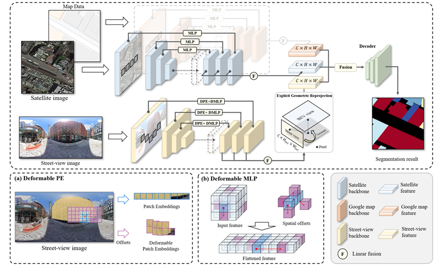 细粒度建筑物属性的识别对于理解城市空间结构与发展动态具有重要意义。遥感影像具有空间连续、覆盖范围广的优势,街景图像则包含来自人视角的立面语义细节。融合这两类互补的跨视角数据,是提升建筑属性识别精度的有效途径。然而,现有方法在处理跨视角差异和空间对齐时仍面临显著挑战,同时全景街景图像存在明显的目标畸变,导致特征投影后在俯视空间中出现几何偏差。此外,虽然基于 BEV 的方法可以实现跨视角数据的精准映射,但这类方法通常高度依赖深度信息以及复杂的相机参数,不利于大范围的建筑物理解。为此,本文提出基于跨视角重投影的特征融合网络(CRFFNet),融合卫星影像、街景图像与谷歌地图数据,以综合利用建筑语义特征与底座几何信息。该方法有效缓解全景畸变与视角差异问题,在较低映射成本下实现了高精度的的建筑精细属性分割。
