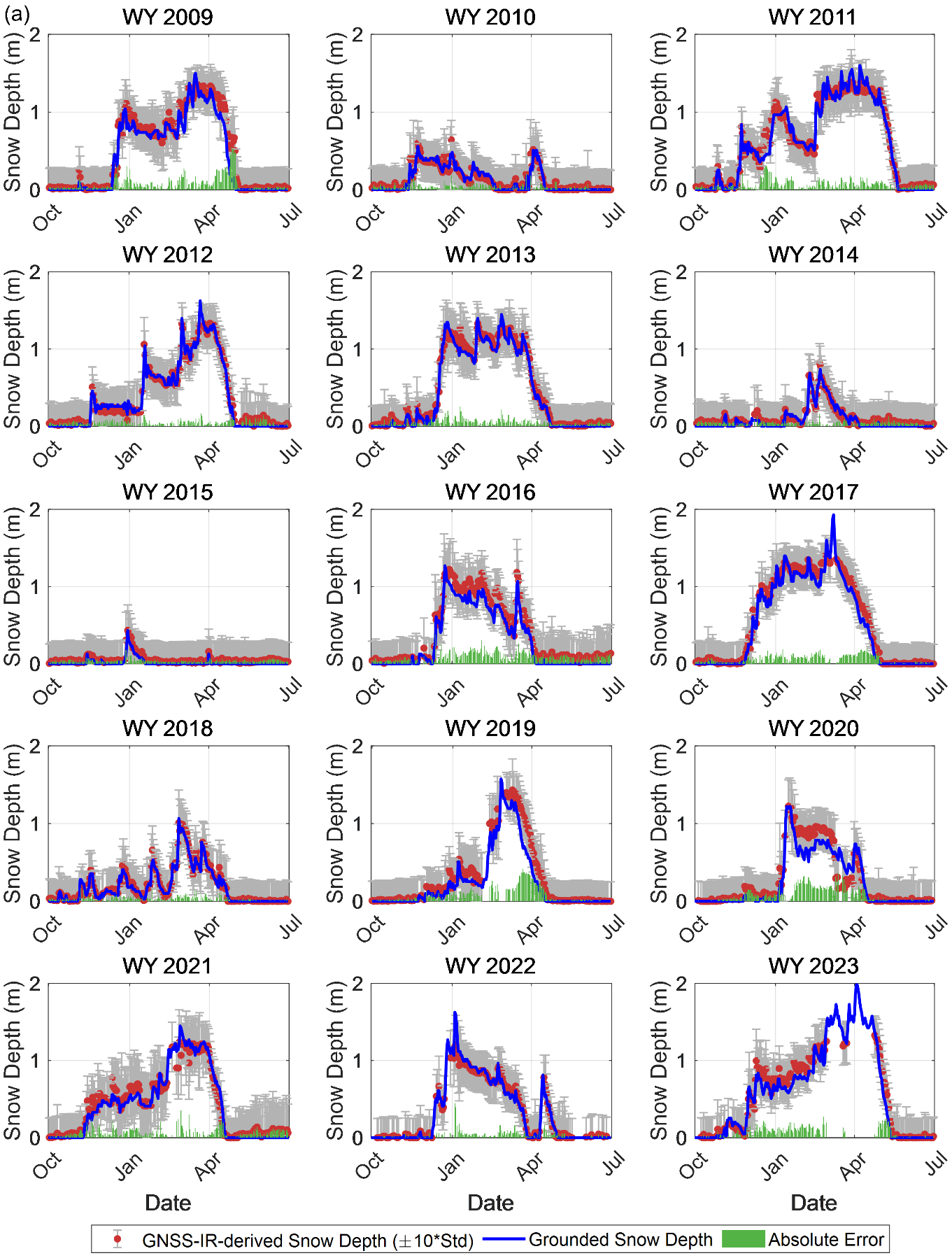 季节性积雪是全球部分典型地区的重要“固态水库”,对区域水安全至关重要。全球变暖导致极端“雪旱”(少雪)和“雪洪”(丰雪)事件频发,严重威胁积雪资源的稳定性。目前主流的雪深监测技术(如原位观测、遥感卫星)存在时空分辨率有限、易受天气影响等局限。全球导航卫星系统干涉反射测量技术(GNSS-IR)作为一种新兴的雪深监测手段,具备分钟级时间分辨率、全天候观测和低成本复用等优势,有望成为构建现代积雪立体监测体系的重要一环。