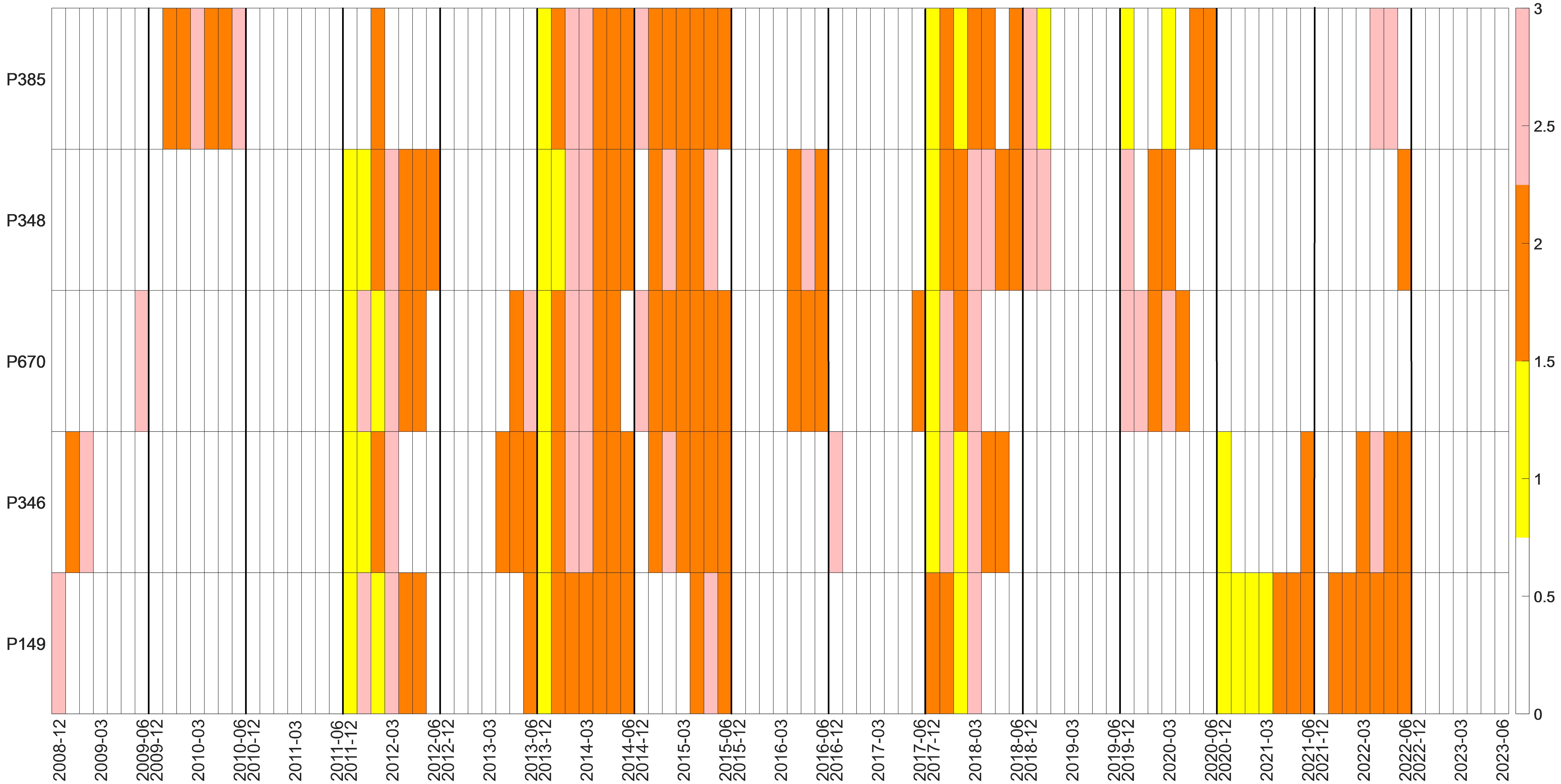 图3 萨克拉门托河流域2009-2023年SSDI时间序列。红色柱体表示雪旱期,蓝色柱体表示雪洪期,灰色柱体表示接近历史平均水平。
