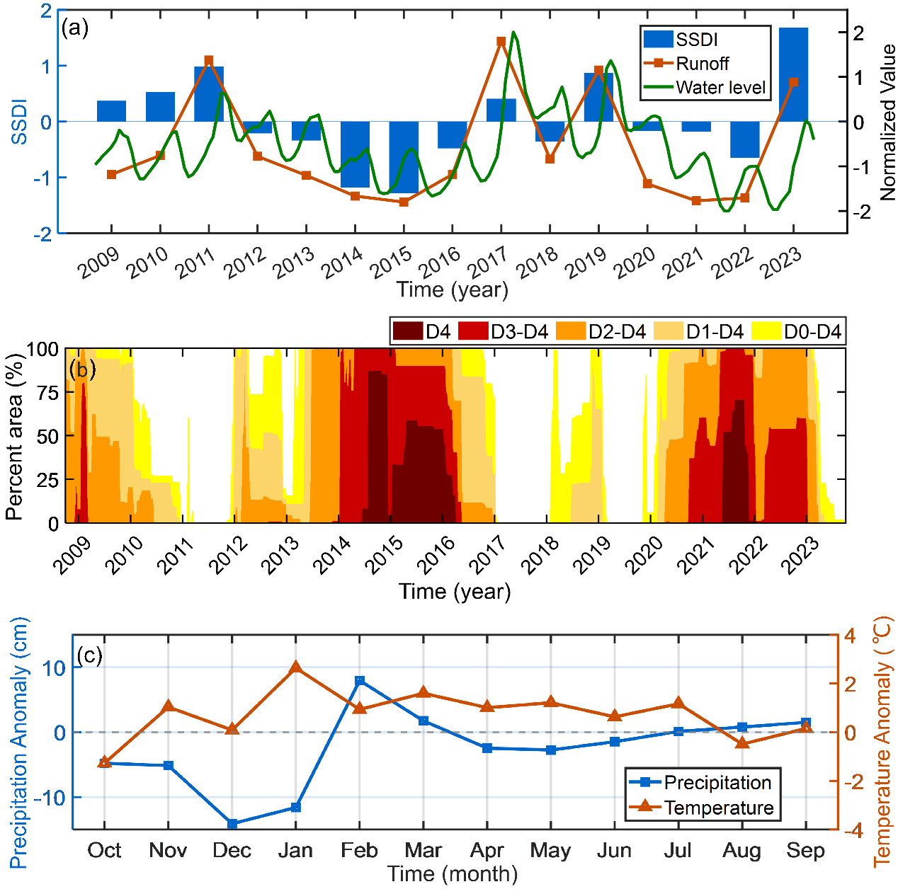 图5 (a) 融雪期(4-6月)SSDI与标准化融雪径流、地下水位的协同变化。(b)流域尺度的美国干旱监测(USDM)指数。(c) 2014水年的月度气温和降水异常。