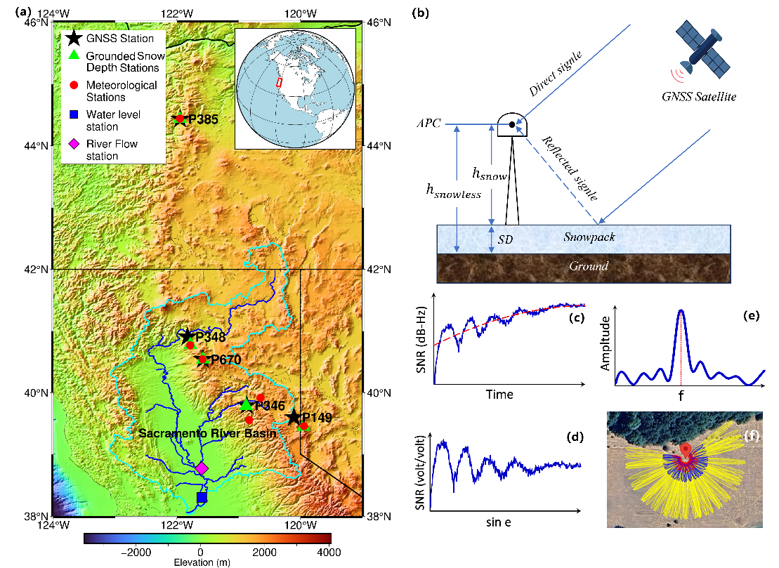 图1 (a) 加州地理环境与地面站点分布。浅蓝曲线为萨克拉门托河流域边界。(b) GNSS-IR雪深反演原理图。(c)-(e)信噪比数据处理和主频提取。(f)不同高度角下的第一菲涅耳反射区。