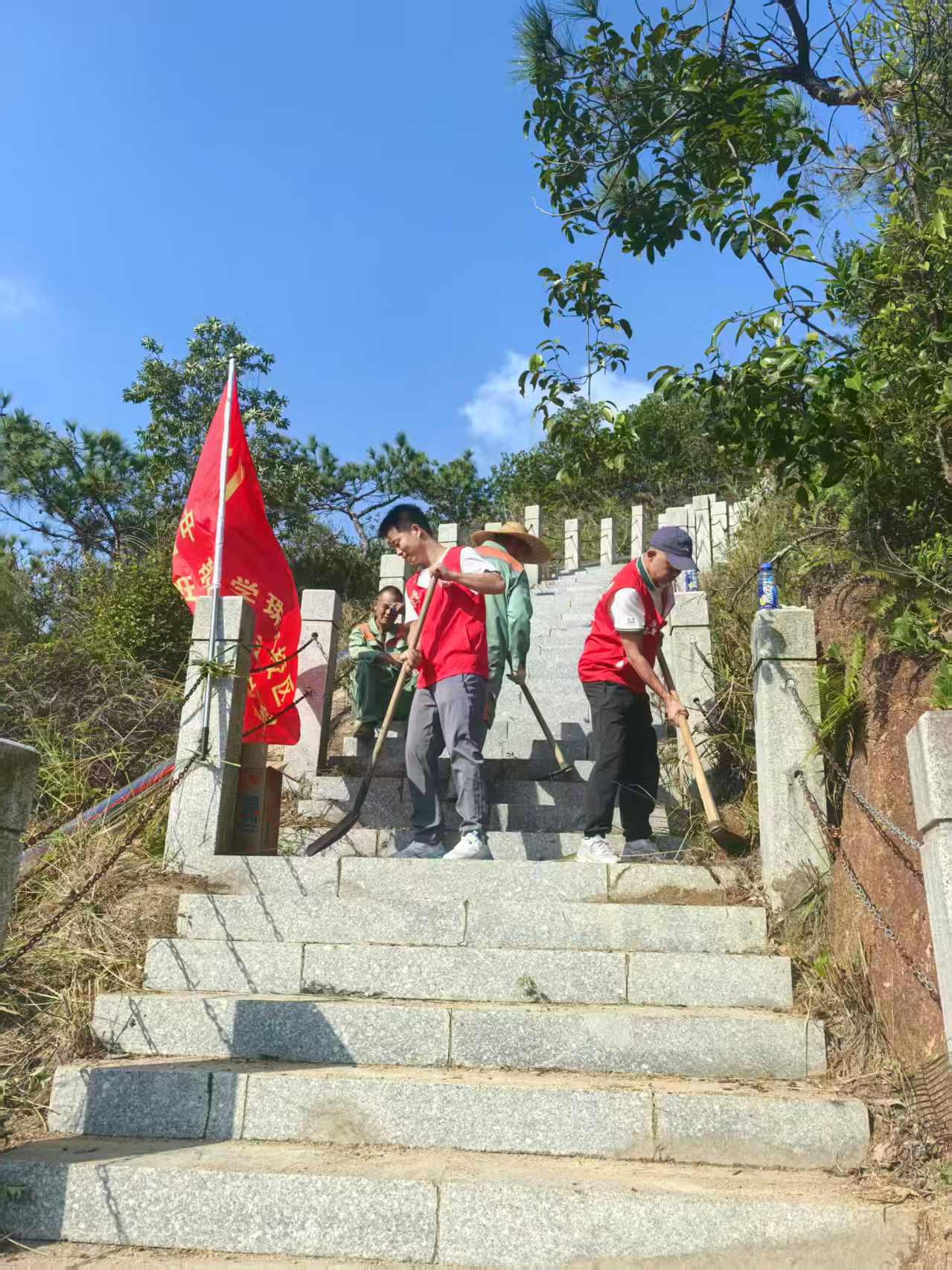 20名24级遥感学院经纬先锋志愿服务队的志愿者们携手校区志愿者老师,耗时近4小时,完成天琴中心至激光测距站山路阶梯的杂草清除与泥土清扫工作,有效改善了山路通行环境。