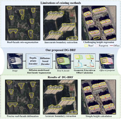 城市建筑物三维重建是智慧城市和实景三维城市建设中的关键任务,为城市规划、环境监测和灾害评估等提供了重要基础信息。传统方法依赖激光雷达或多视角影像,受限于高昂的数据获取成本与有限的覆盖范围,难以实现大范围应用;而基于单视角遥感影像的重建方法因其成本低和覆盖广的特点,为大范围建筑物重建提供了可行路径。然而,现有的单视角重建方法仍面临显著挑战:已有方法所依赖的传统模型表征能力不足,导致建筑物轮廓提取精度受限,并容易出现屋顶与立面轮廓混淆的问题。此外,单视角影像的有限信息限制了现有方法通过回归方式直接预测建筑物高度的精度。为此,研究团队提出了基于扩散模型和几何先验知识的建筑物重建框架(DG-BRF),通过设计基于扩散模型的建筑物屋顶-立面分割网络和几何先验知识驱动的建筑物偏移向量计算方法,有效解决了已有方法存在的建筑物轮廓提取精度低和高度估计误差大等问题,实现了更高精度的建筑物三维重建。