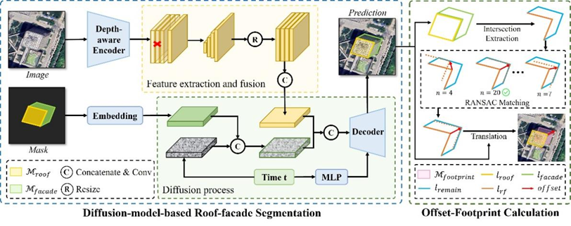 本研究针对现有的单视角建筑物三维重建方法存在的轮廓提取精度低和高度估计误差大等问题,提出了一种基于扩散模型和几何先验知识的建筑物三维重建方法,通过构建基于扩散模型的屋顶-立面分割网络和几何先验知识驱动的偏移向量计算方法,显著提升了基于单视角遥感影像的建筑物三维重建精度,为低成本大范围建筑物三维重建提供了新的解决方案。