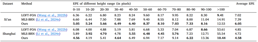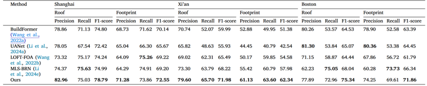 实验结果表明,相较于通用分割方法、遥感场景分割方法和三维重建方法,本研究所提出的 DG-BRF方法在建筑物轮廓提取与高度估计两方面均表现出显著优势。在建筑物轮廓提取方面,通过引入扩散模型并设计深度感知编码器,DG-BRF能够在复杂城市场景下准确区分和分割建筑物屋顶和立面轮廓,进而获取更为准确的建筑物底座轮廓。与现有的分割及三维重建方法相比,DG-BRF的底座提取结果的F1分数提高了2%-12%。在建筑物高度估计方面,相较于现有的单视角三维重建方法,DG-BRF的高度估计精度提升了3%和13%,这主要得益于所提出的建筑偏移向量计算方法充分挖掘了建筑物几何先验知识,通过鲁棒的屋顶-立面的匹配算法准确估计建筑物高度。