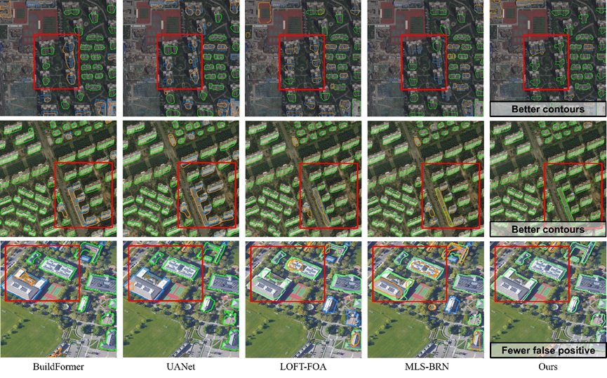 图5 不同方法的建筑物提取结果的定性对比。绿色/橙色/蓝色分别表示TP/FP/FN