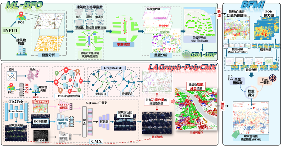 项目针对粤港澳大湾区复杂城市环境中建筑功能识别难题,整合遥感影像、建筑轮廓、POI及高程模型等多源异构数据。在数据层面,团队构建覆盖近400万栋建筑的GBA-UBF数据集,集成高精度数字地面模型。在算法层面,团队创新提出LAGraph-PolyCMX算法框架,将POI语言信息与遥感影像、几何形态特征相结合,通过贝叶斯框架实现多源信息的优化融合,提升识别结果的鲁棒性。针对缺乏真值验证的难题,团队自主设计BFMI指标,为建筑物功能精度的定量评估提供可行方案。