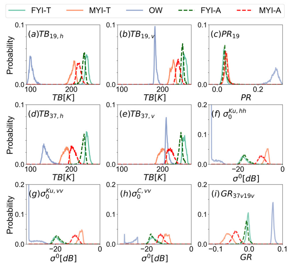 图 1 两类一年冰(FYI)、两类多年冰(MYI)以及海水(OW)的各微波参数概率密度分布