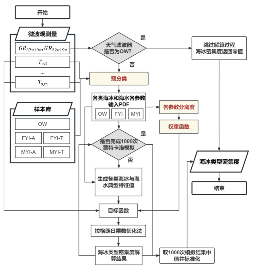在全球变暖的背景下,近几十年来北极海冰持续快速缩减并呈现出显著的“年轻化”趋势。海冰类型密集度作为表征海冰类型及其覆盖面积比例的关键参数,在极地海冰监测研究中具有重要价值。主被动微波遥感技术因其具备全天时、全天候的观测优势,已成为海冰类型密集度反演的重要手段。然而,海冰物理特性的复杂多变导致其微波辐射/散射特性表现出明显的时空差异,这为北极海冰类型密集度的准确反演带来了严峻挑战。
