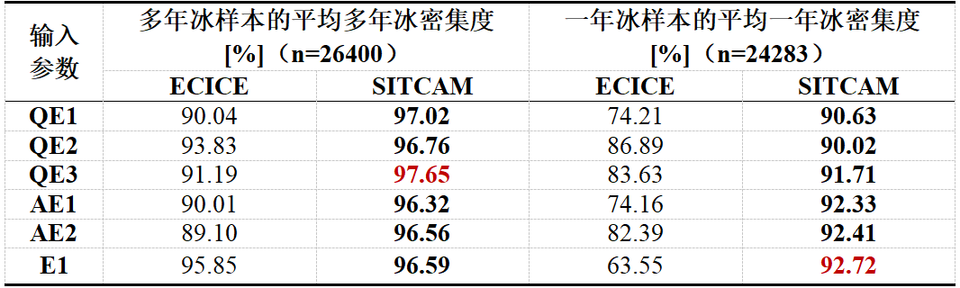 结果显示,优化后的模型SITCAM反演结果与海冰年龄产品吻合度更高(图3),其对多年冰和一年冰样本的识别能力较原模型有显著提升(表1)。同时,基于SAR影像的验证表明,在不同海冰分布场景下,SITCAM的反演结果均具有较高的精度。