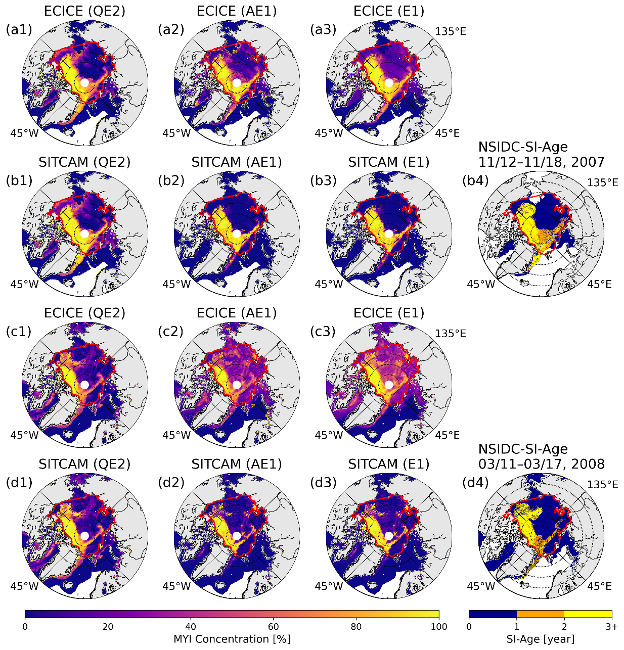 图 3 2007年11月15日和2008年3月15日多年冰密集度反演结果及NSIDC海冰年龄产品的北极多年冰空间分布图